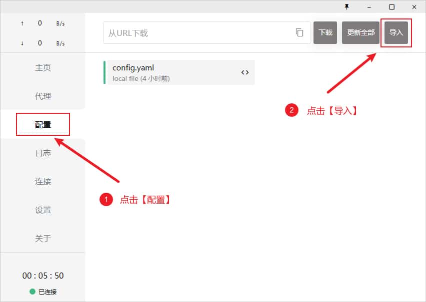 然后点击界面左侧菜单 配置,在顶部输入框填入刚才复制的 URL 连接地址并点击 下载 即可,下载完成后点击对应的配置文件即可添加配置文件,如下图所示。