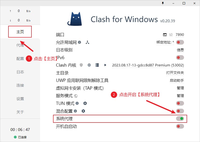启用代理,需要点击界面左侧菜单 主页 选项卡,找到 系统代理 并开启开关即可,开启状态下按钮状态为绿色,如下图所示为开启状态。