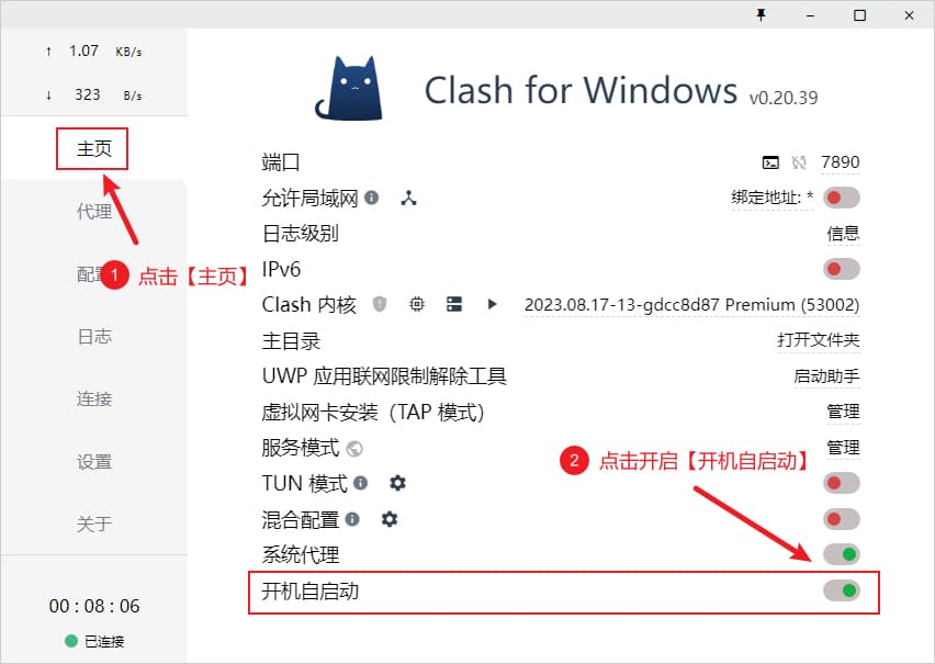 设置开机自启动,需要点击界面左侧菜单 主页 选项卡,找到 开机自启动 并开启开关即可,开启状态下按钮状态为绿色,如下图所示为开启状态。